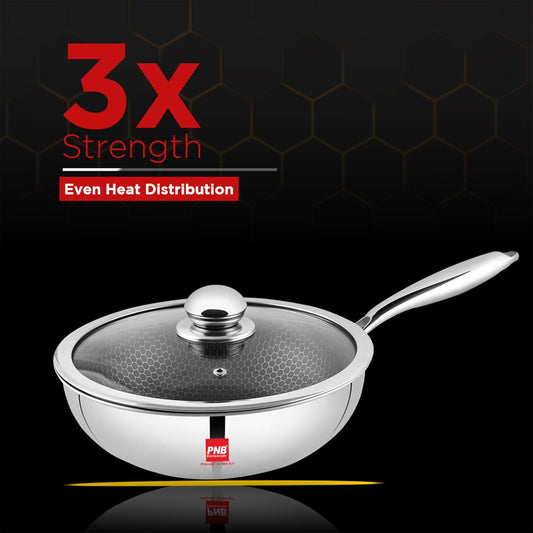 PNB Kitchenmate Triply Wok with Lid - 3-Ply Clad Construction - 28 cm Wok Pan - Long Handle for Control - Cookware for Indian Cooking