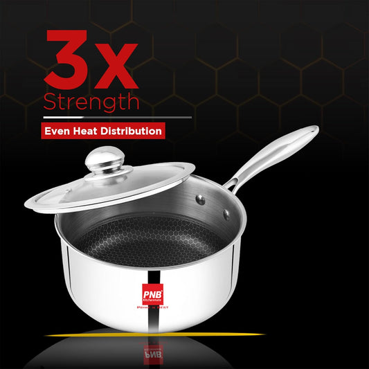 PNB Kitchenmate INOX Triply Saucepan with Lid - Stainless Steel Saucepan - 0.9L Capacity & 14 cm - Gas & Induction Compatible - 3-Ply Clad Construction